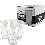 Why buy a single Imperial Pint Glass when you can get yourself (or someone else) a fantastic set of four? Not only do they come packaged in a perfectly giftable box, each pint glass inside is brilliantly designed with a heavy ridge for easy gripping. They're resistant to breaking, even when they're stacked. The official crown pint seal is etched into each pint for authenticity. In stock and ready to ship. Features: Designed with a heavy ridge for durability and easy stacking. Features official crown pint seal etched in the glass. Imported from England. Specs: Dimensions: 3 3/8"W x 5 3/4"H. Capacity: 20 fl oz. Includes: (4) Pint Glasses.