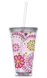 BPA-Free plastic double-wall tumbler with straw, printed in a pink swirly floral pattern. Holds 24 fluid ounces.